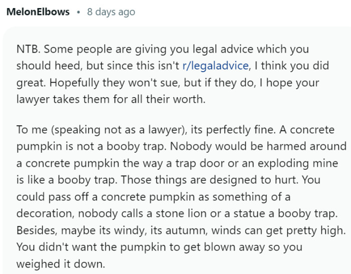 Their retaliation was innovative: they chose a large pumpkin and filled it with concrete. This makeshift gargoyle was then placed in the usual spot where OP's pumpkins had graced previous Halloweens.