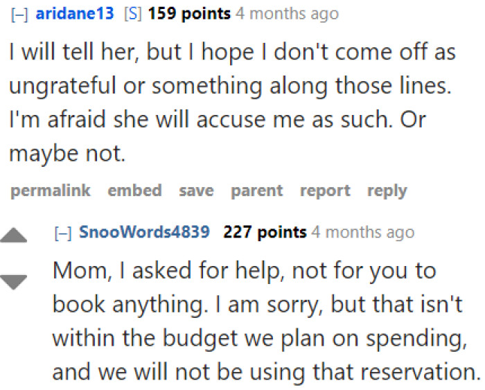But she booked them a room that's out of their budget, and to make matters worse, she did it without their permission.