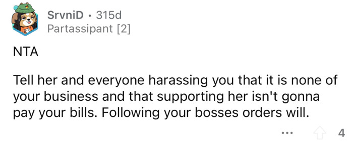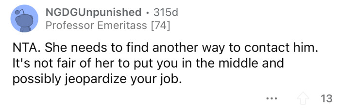 "I understand why she asked you, but it's not fair to risk your job."
