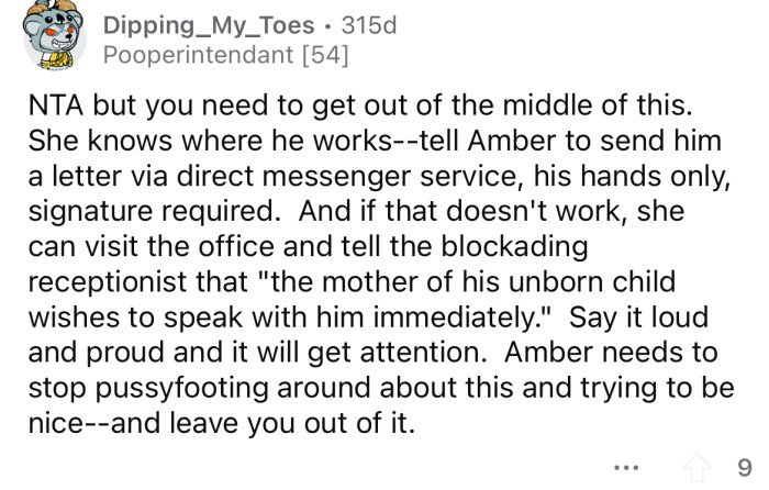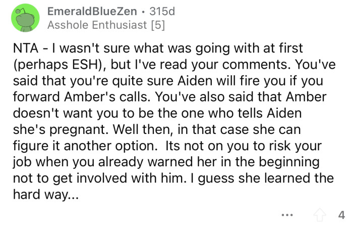 Amber has been asking the OP to help her get in touch with Aiden, but the OP has told her that he doesn't want to speak with her. Amber doesn't want the OP to tell Aiden about the pregnancy, so the Redditor is in an impossible position.