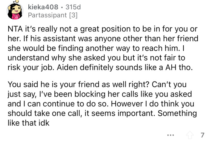 Now the OP is stuck in the middle of her friend and her boss. She wants to support her friend, but she is scared that she will lose her job if she doesn't do what Aiden asks of her.