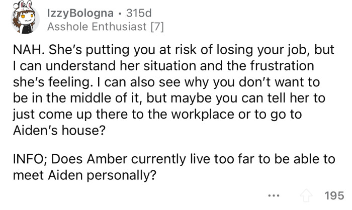 What are your thoughts on this situation? Do you think the OP is doing the right thing by staying out of it, or should she help Amber trick Aiden into speaking with her?