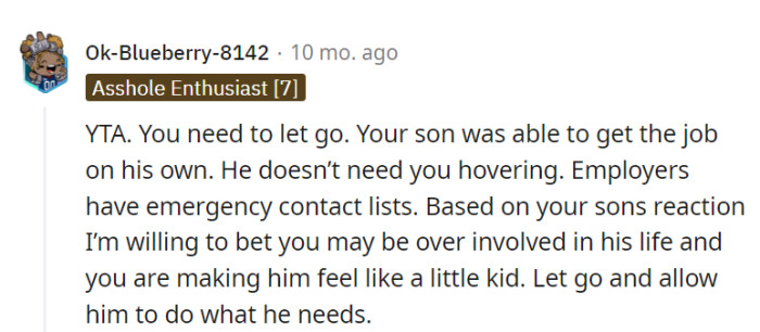 At first, their son thought it was strange and unnecessary. But when OP tried to clarify the need for such a contact, the situation took a dramatic turn. Their son suddenly lost his cool and firmly refused to share the boss's number. He accused OP of treating him like a four-year-old, leaving OP taken aback by this intense reaction.