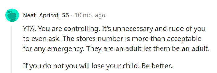 RedditOP asked her son for his boss's number in case of emergencies, but he refused, viewing it as unnecessary. This disagreement sparked tensions within the family, with her husband deeming the request overly controlling.