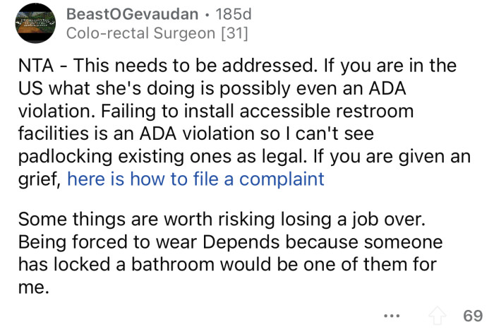 Reddit/Temporary-Weekend319She explained that she has some health problems that cause her a lot of pain if she's unable to use a bathroom when she needs to.