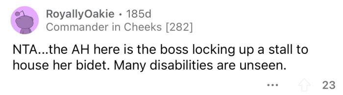 The OP asked if she's an a**hole for wanting to talk to her boss about the accessible bathroom stall.