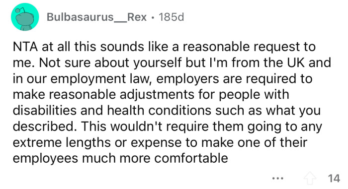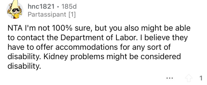 Reddit user u/Temporary-Weekend319 shared a story in the r/AITA (Am I The A**hole?) subreddit about some difficulties she's been experiencing at work. The Redditor explained that she was recently diagnosed with lupus and kidney disease, both of which make it very painful for her if she isn't able to use the restroom when needed.