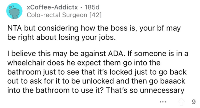Now, the OP has resorted to driving to a nearby restaurant to use the restroom because when she expressed her worries to her boyfriend, he told her not to say anything since they could lose their jobs. Keep scrolling to see how people reacted.