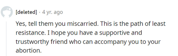 "Miscarriage" is the convenient route in this case, and a supportive friend for the abortion can make it a smoother journey.