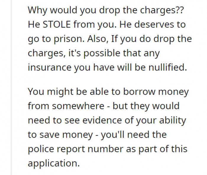 The boy's family found out and went on to harass OP, even though she was the victim in the situation. She was assured by her boyfriend's brother that they would help pay back the missing money, so she should just drop the charges she raised.