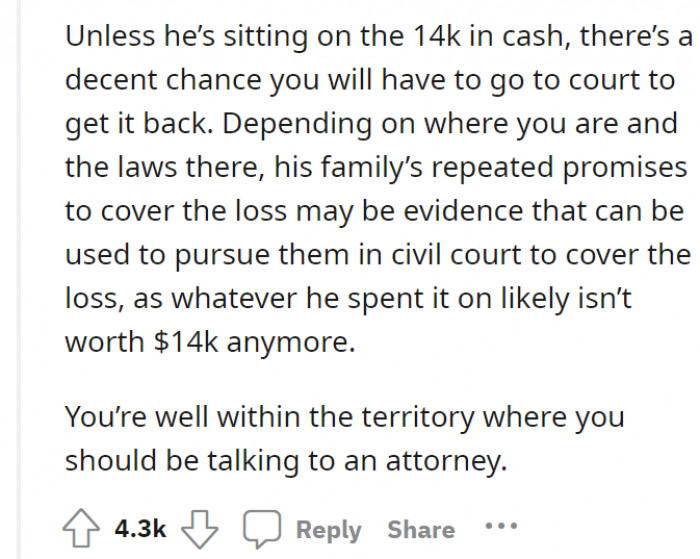 It's definitely disheartening to lose so much money in just the blink of an eye, and it is even more heartbreaking to find out that the one who stole it was someone you thought you could trust with your whole heart. That boy is going to be crawling back, begging for forgiveness, for sure!