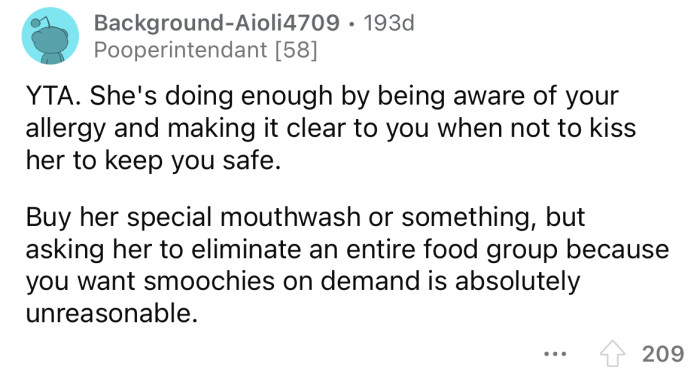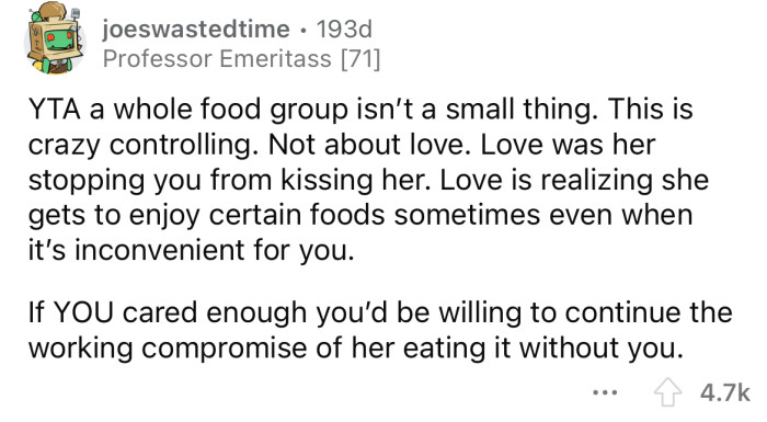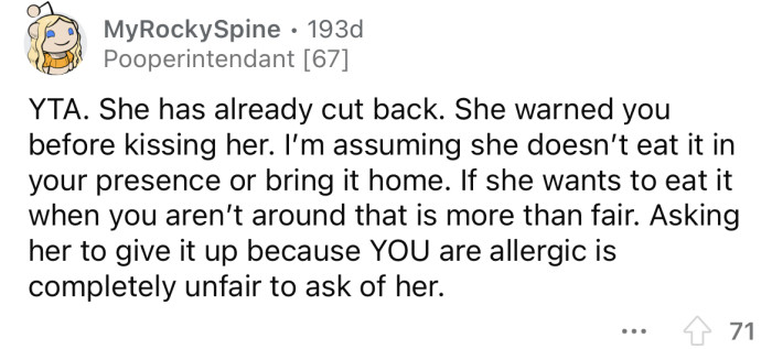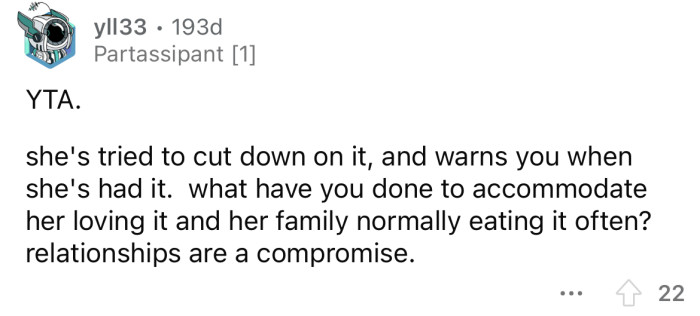 But OP's girlfriend says she isn't prepared to give up her favorite food entirely and shouldn't have to.