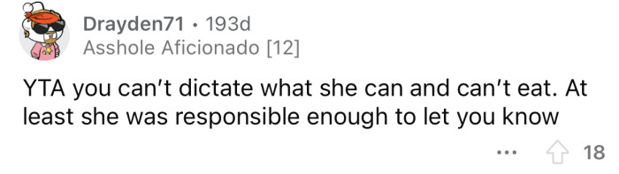 "You can't dictate what she can and can't eat."