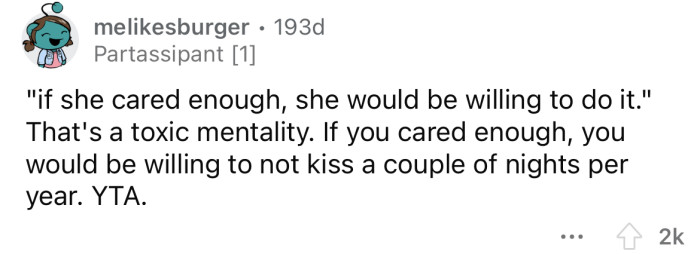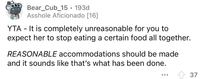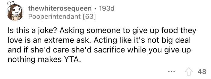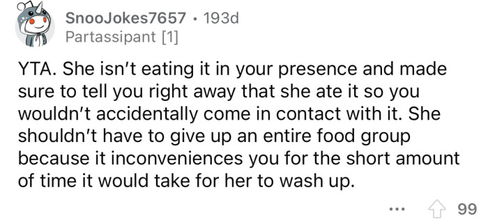 Reddit/Huge-Lawfulness-6168He says it's an "inconvenience to him" when she eats it, and she should be willing to give it up.