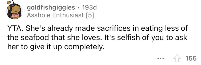 When the OP told his GF that he would prefer it if she gave up eating seafood completely, she refused saying that she was already making a sacrifice by not eating it as often. But the OP says it can be an "inconvenience to him" when she eats it, and if she really cared about him she would give it up.