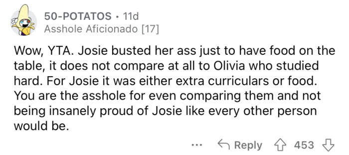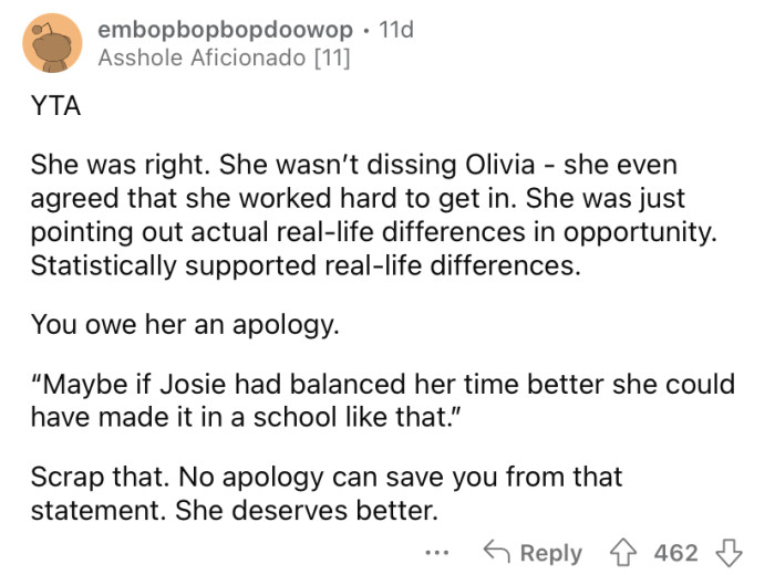 The OP confronted Josie about it because he believed she was referring to Olivia, who attends one of the top colleges, while Josie goes to community college. Josie said she wasn't talking about Olivia specifically but was just saying that it tends to be easier for privileged kids compared to kids like her who have had to work much harder just to survive.