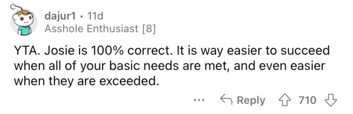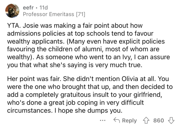 Recently, when Josie was discussing colleges with her friends, the OP overheard her talking about how easy it is for some kids to get into good schools because their parents have money.
