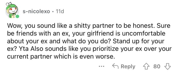 "Sounds like you prioritize your ex over your current partner."