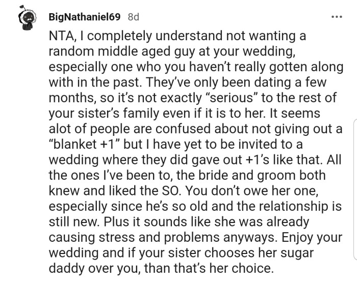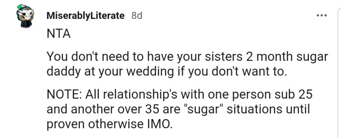 "Enjoy your wedding, and if your sister chooses her sugar daddy over you, then that’s her choice."