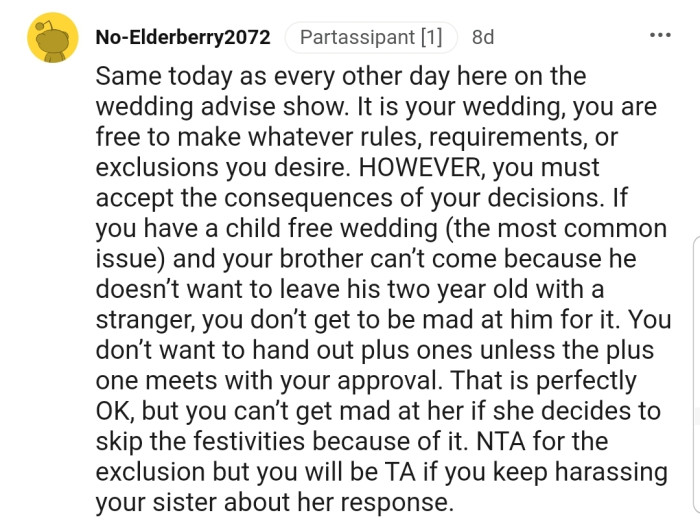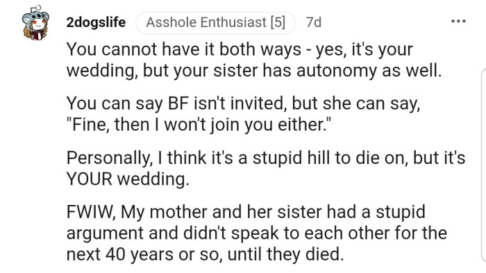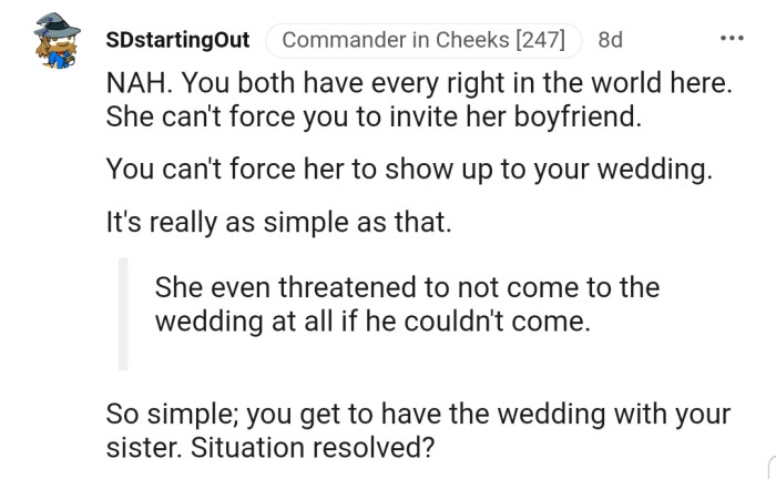 However, we also have commenters who seem to absolve both parties of wrongdoing. This is based on the belief that although OP can choose who attends her wedding, her sister also has the right to decide not to attend.
