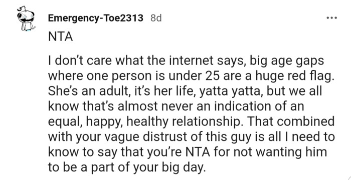 "NTA. I don’t care what the internet says; big age gaps where one person is under 25 are a huge red flag."