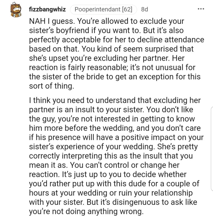 "You’re allowed to exclude your sister’s boyfriend if you want to. But it’s also perfectly acceptable for her to decline attendance based on that."