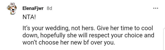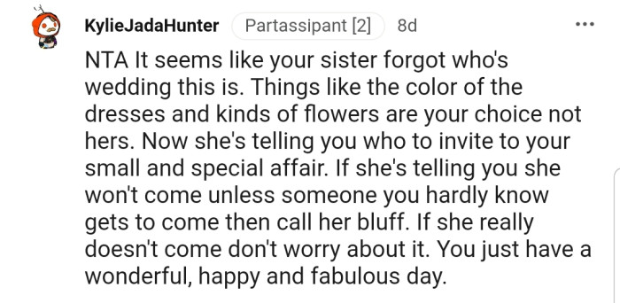 Some commenters believe OP is NTA, while her sister is the AH. According to them, it’s her wedding, and she should be able to decide who will attend.