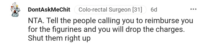 "Tell the people calling you to reimburse you for the figurines that you will drop the charges."
