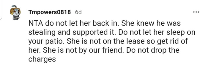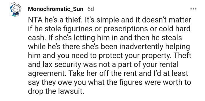 "If she’s letting him in and then he steals while he’s there, she’s been inadvertently helping him, and you need to protect your property."