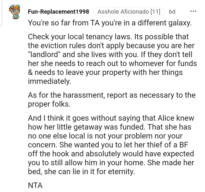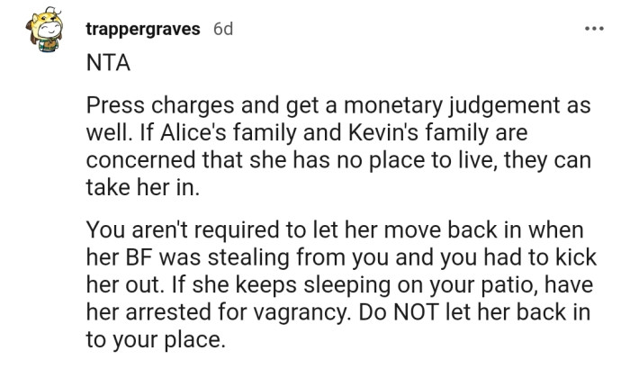 While OP battles threats and accusations, she can't seem to shake off the image of her best friend sleeping on her patio. Do you think OP went too far with this, or do you feel Alice and her boyfriend are getting what they deserve?