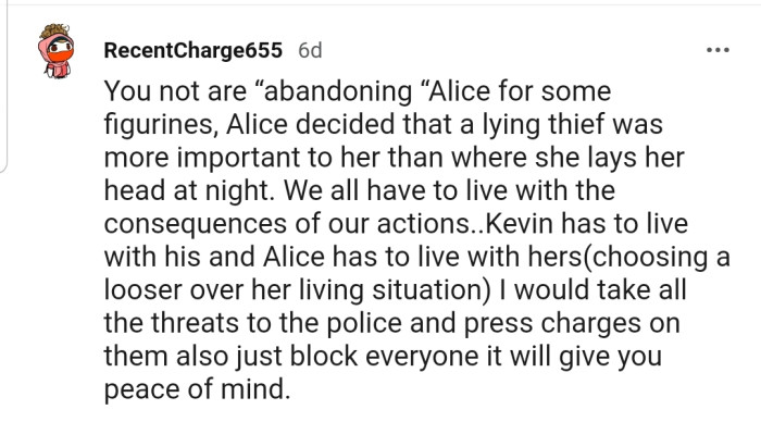 Reddit.comOP later caught Kevin on camera stealing her figurines. In response, she had him arrested. Even with the evidence, Alice has been begging OP to let Kevin go.