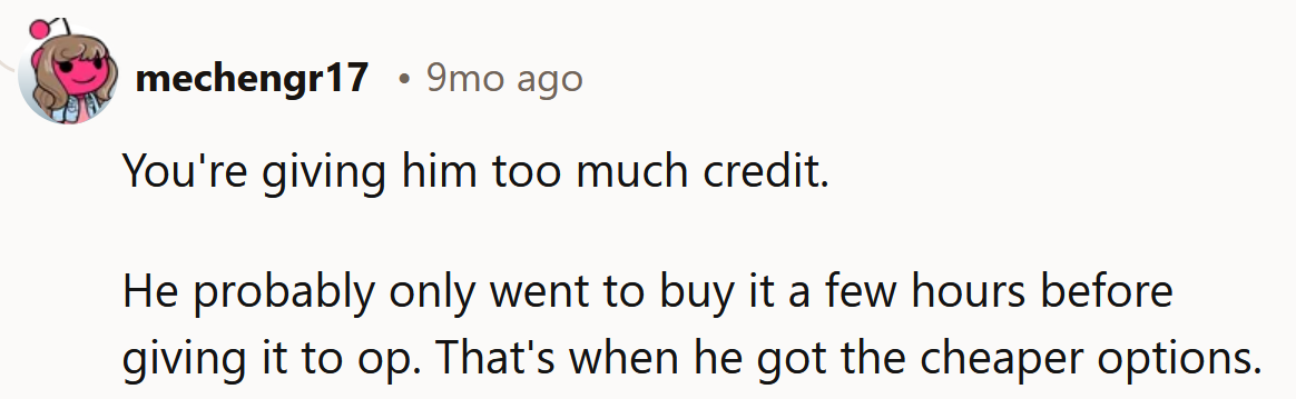 Of course, the OP told him he didn't have to, but he insisted. He told the OP he had already purchased it for her, so she decided she might as well spend her money on something else.