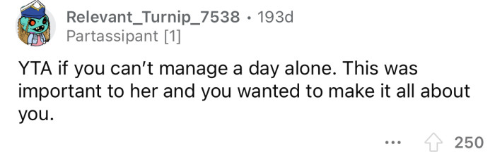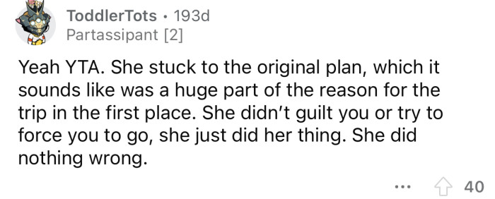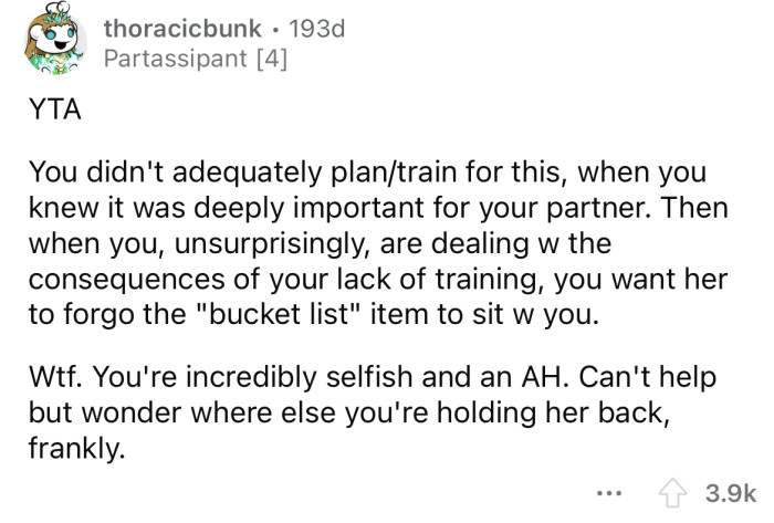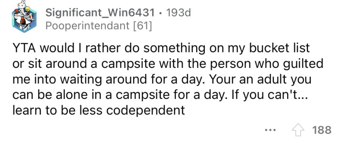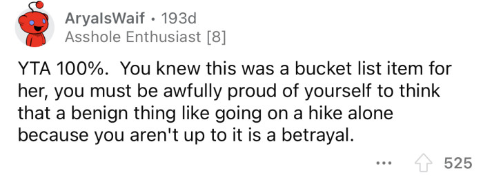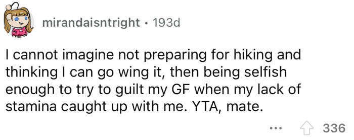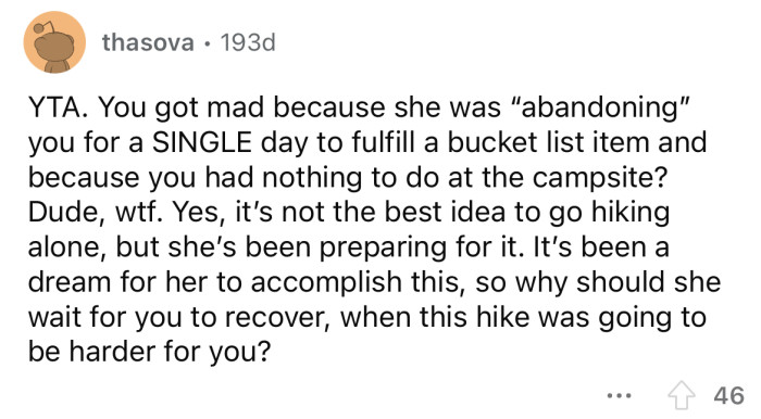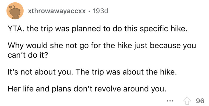 Reddit/deletedWhen the OP decided not to go because he hadn't recovered from the previous day's hike, his girlfriend opted to go alone.