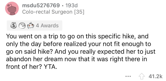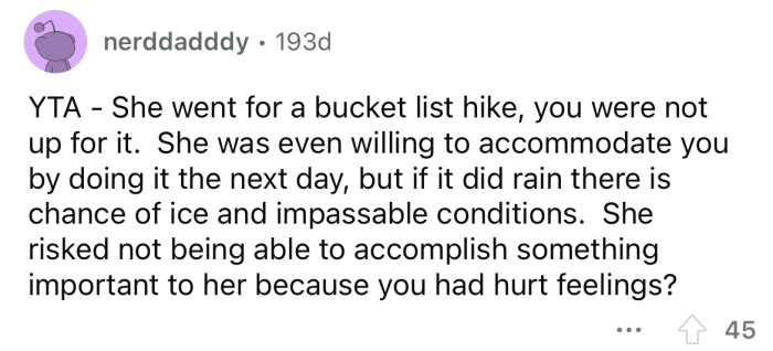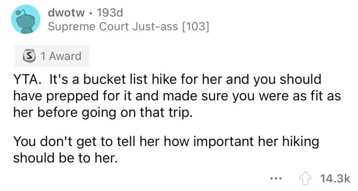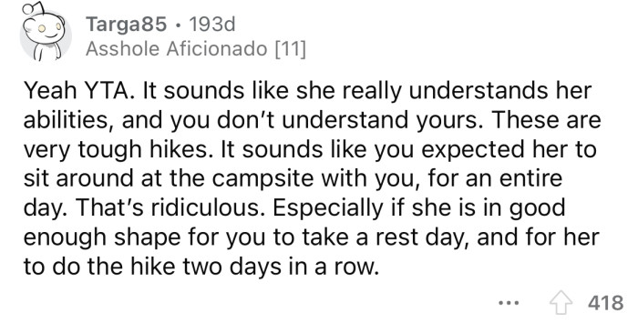 The Redditor says they went on a hike the day before as well, and since he is not as fit as his girlfriend, he needed some time to recover. He was also concerned because the rangers had advised that it was a difficult hike that would be hard to complete in one day.