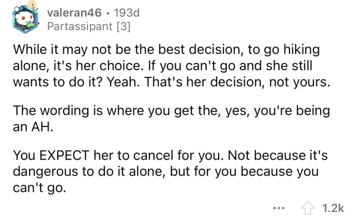 OP's girlfriend completed the hike as planned, but the Redditor says that "people are more important than activities." Keep scrolling to see how people reacted.