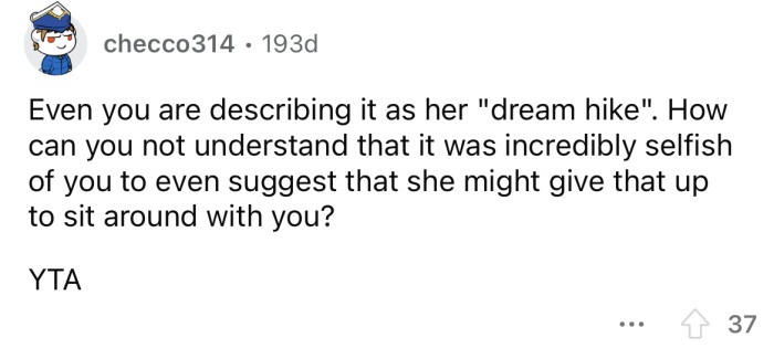 But the OP was upset that his girlfriend chose to go on the hike without him.