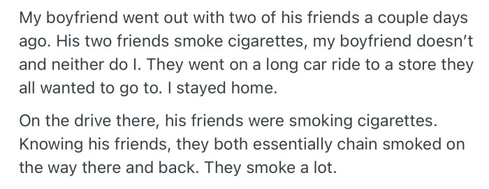 “NTA. Idk how your BF can possibly not realize how bad smoke clings to clothes, hair, and skin.”