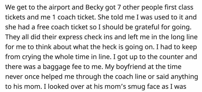 When they got to the airport, OP saw that Becky and the seven other family members would be flying first class while OP received a ticket for a coach seat. Becky told OP that she was used to that anyway and that OP should be grateful for just being included.