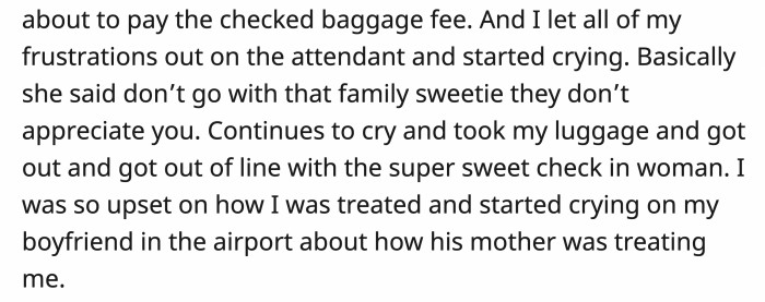 The check-in attendant told OP that she shouldn't go on the trip with her boyfriend's family because they obviously don't appreciate her.