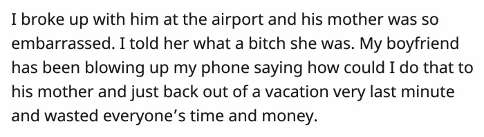Ever since that dramatic but inevitable breakup, OP's ex has been trying to contact her to ask how she could do that to him and his mom. He's also trying to guilt OP by saying that she wasted everyone's time and money when she backed out of the trip at the last minute.