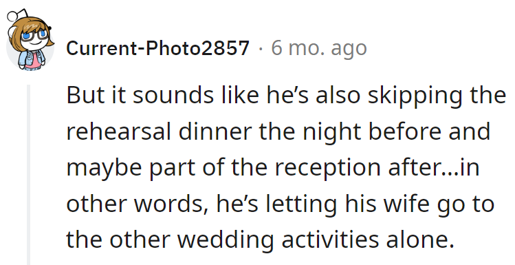 "He's letting his wife go to the other wedding activities alone."