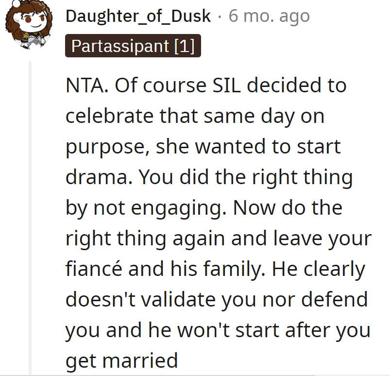 Ongoing tension with the sister-in-law creates challenges. The fiancé partially acknowledges but doesn't fully validate the hurt.