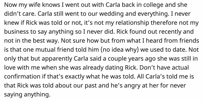 OP is not sure how exactly Rick found out, but from what OP learned, a mutual friend let the tidbit slip. More than that, years ago, Carla said she was still in love with OP despite already dating Rick.