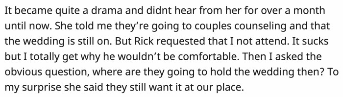 OP was disappointed, but he understood Rick's discomfort. The only question he has is: where will the wedding take place?