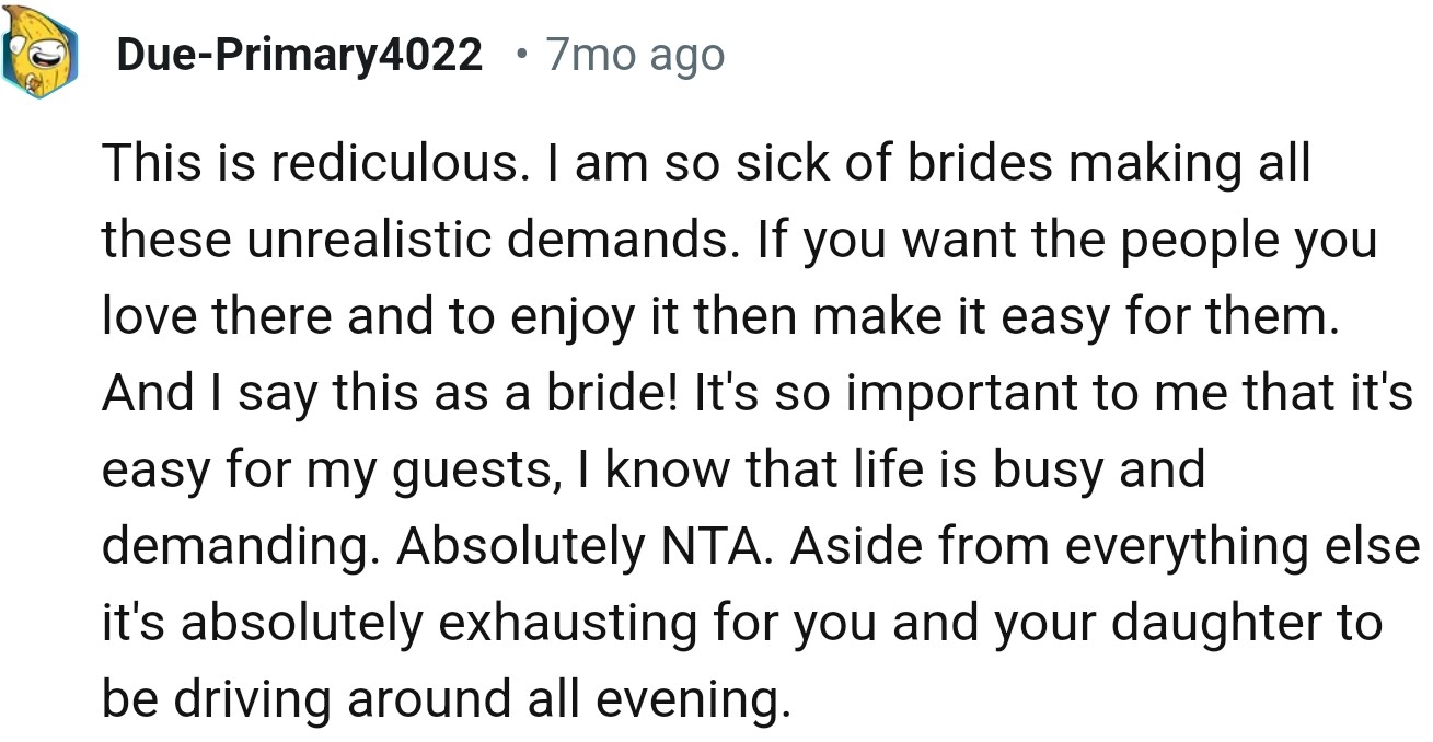 There was only an hour gap between the rehearsal and the dinner, and the bride expected them to find a babysitter or make other arrangements within that time. It seemed like a logistical nightmare.