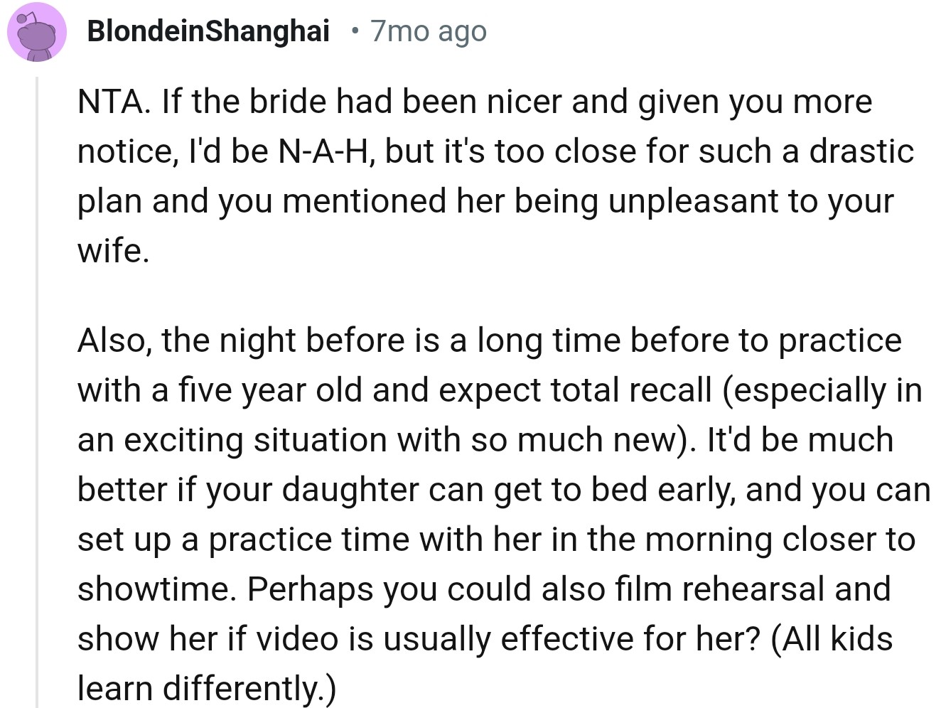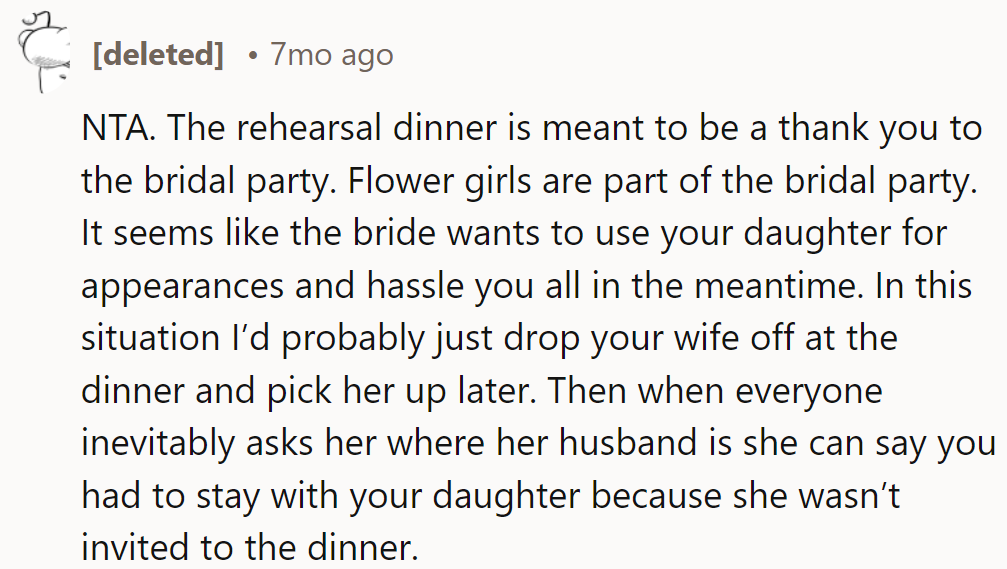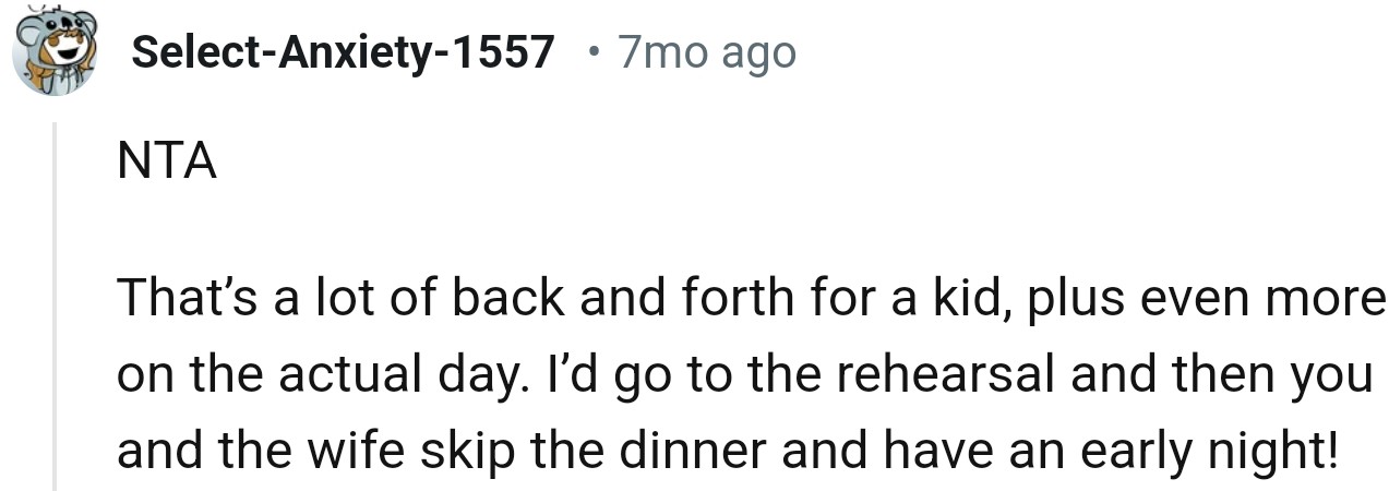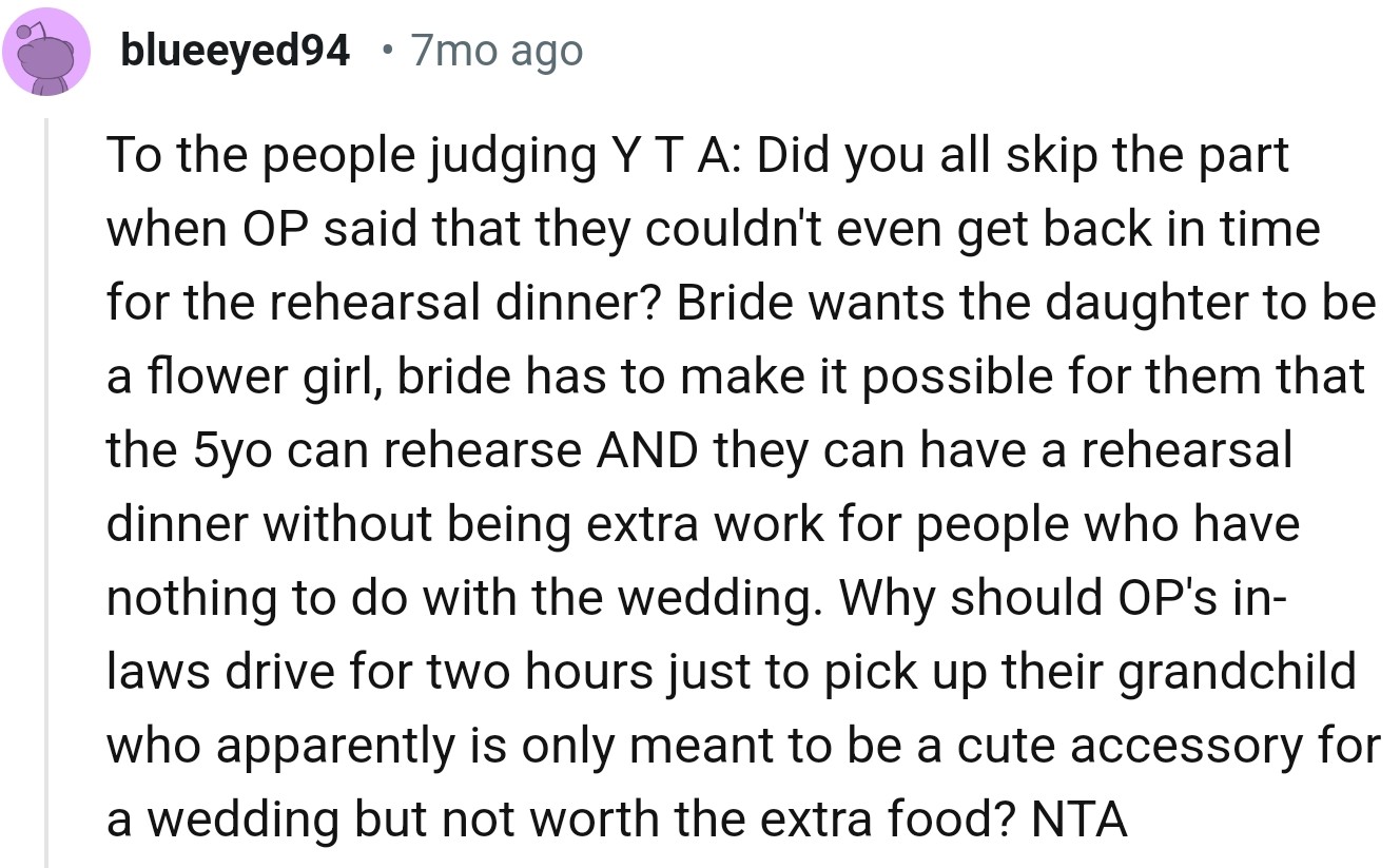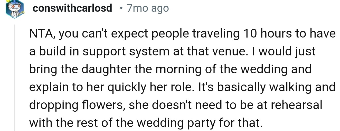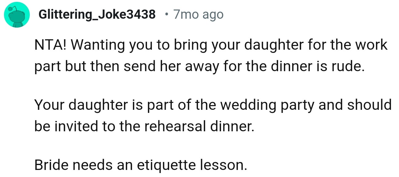 The options? Miss part of the dinner, endure a two-hour round trip, or come up with an alternate arrangement on the fly. The hassle didn’t seem worth it, so OP told the bride their daughter couldn’t attend the rehearsal.