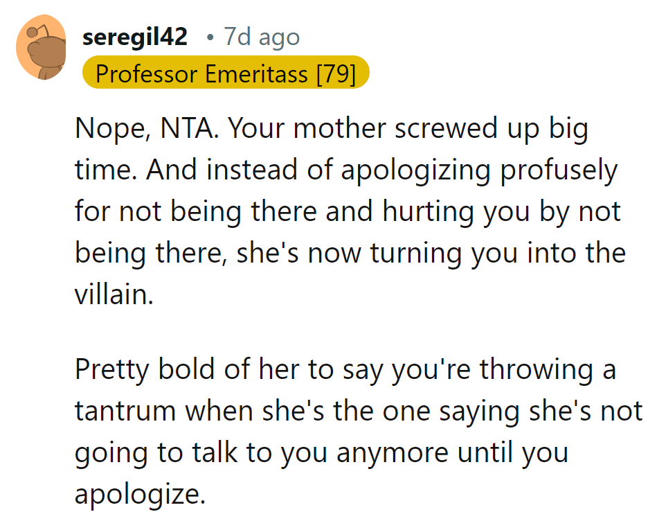 Mom scolds OP for self-centeredness. OP still refuses to see her, angering mom, who demands an apology for "childish tantrums."