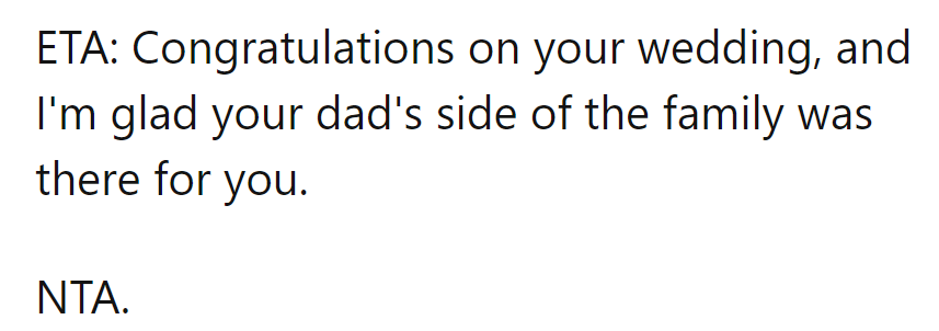 OP's mom remarried, adding half-brother Jack. At 23, OP married; mom's family missed it, but dad's side made it special.
