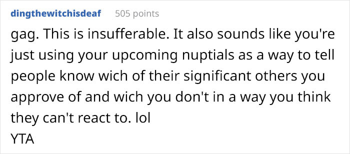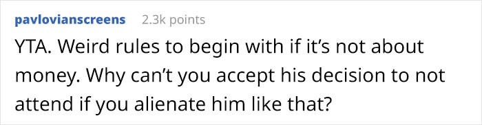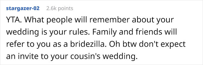 He cares more about some moment of discomfort rather than supporting his cousin. Of course, he has an option; I don’t disagree with that. But that decision could also be disrespectful of him, no?Most of the people in the comments weren't concerned by OP's wedding rules, but the way she responded when her relative declined her invitation annoyed them