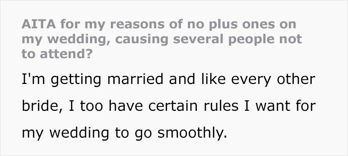In the case of Reddit user TAplusonedrama, who is getting married, she chose not to apply the plus-one tradition. This means that only those who receive an invitation can attend.